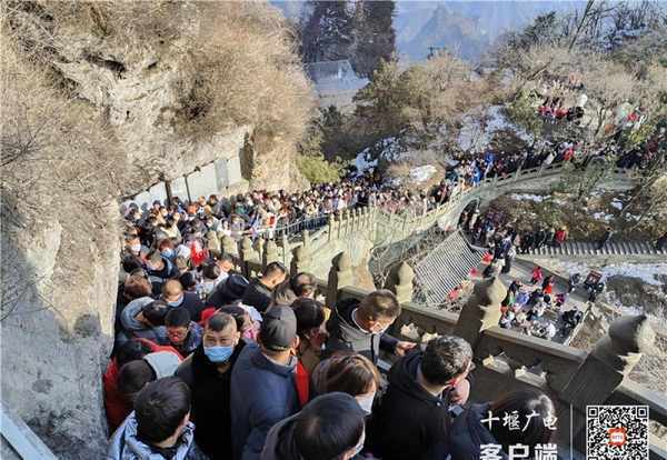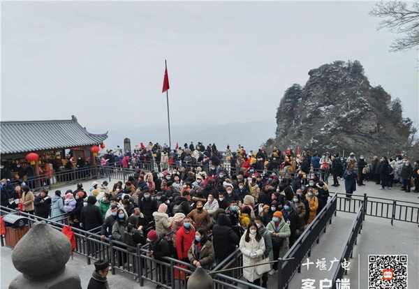 不到7点钟武当山金顶小道场就排起了长队,许多游客选择在这一天来金顶登顶祈福,较前两日出行小高峰提前了一小时。7:30景区游客服务中心停车场也基本停满,车辆分流到武当新天地、通神沟停车场。景区通过分段管控、语音提示、人员疏导分流游客到南岩方向太子坡、紫霄宫、南岩宫等景点,缓解索道排队和金顶景区高峰。