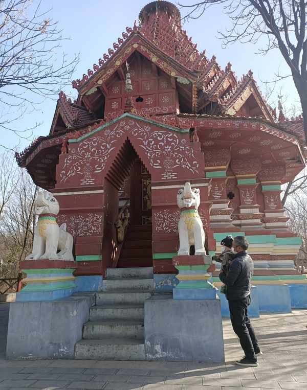 晚上长安塔内四面八方的灯光打过来以后,在院内远望长安塔,无论从哪面观看,均会浮现出一棵巨大的菩提树图案,也就是说,这棵巨大无比的树是由4株菩提树汇聚成一棵茂密的菩提树!远看过去,长安塔气势恢宏。