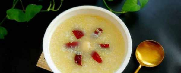 做法:米饭半小碗,小米是米饭的一半,干百合、大红枣准备好;大红枣,切去枣肉,切成小块;干百合、小米、大米,混合洗净,加入切碎的红枣,加约6倍于材料量的水煮熟。我用电饭煲用小火煮粥。整个过程需要1个小时。时间一到,又稠又甜的粥就做好了。