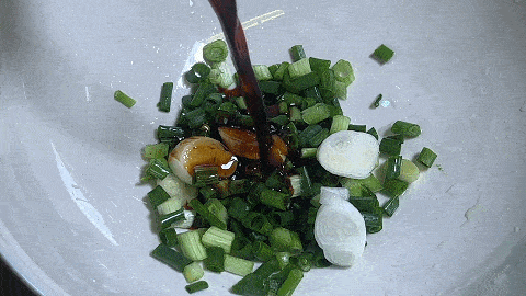 1、 小葱择洗干净切成葱花放入大碗中,加入生抽,香醋,食盐,味精,芝麻香油,浇上煮面条的汤