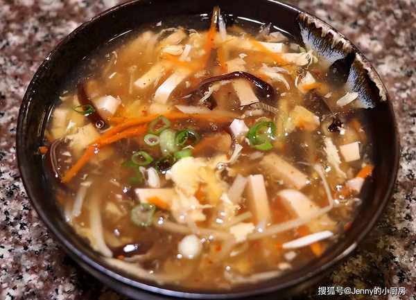 煮两分钟后,加入醋、胡椒粉搅拌均匀。再倒入适量淀粉水,调整好浓度。