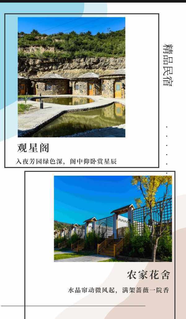 一期民宿体验区内涵盖设计新颖、风格不同的六大特色乡村民宿集群、四大系列餐厅以及文化场所,目前已投入使用运营,另外地球仓,名宿与会议为一体的会务中心已在装饰收尾阶段。该区域的入住接待能力为200人以上,现阶段实行预约定制服务模式,可提供私人定制服务,根据客户的需求,提供涵盖求婚仪式、餐饮、住宿、团建、会务、生日宴会、同学聚会等一站式管家服务。
