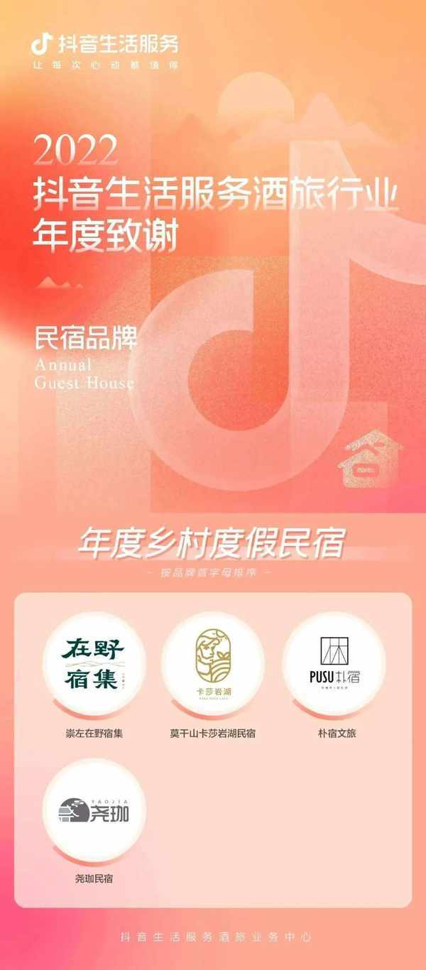 2023年01月17日,抖音官方平台发表的《抖音生活服务2022酒旅专题报告》丨多元发展趋势解读,年度酒旅品牌发布一文中,我们共同见证了《2022抖音生活服务酒旅行业年度致谢》榜单的发布,评出了2022年度特色体验民宿、年度城市度假民宿、年度乡村度假民宿等门类。毫无疑问,这份榜单代表的是中国酒旅行业未来的发展风向。