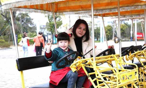 在公园休闲区的草地上,市民韦凤丽和爱人正陪着年迈的父母晒太阳,在绿意盎然的景色中拍下一家人温馨的照片。“今天天气晴朗,带我爸妈出来玩一下,公园里空气清新、风景迷人、视野辽阔,湖水与塔相互照映,在这游玩真是一种享受。”