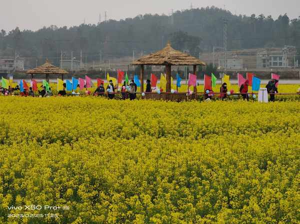 进入彩蝶飞舞的田园,置身于花的海洋,寻花思情,领略花海的万种风情。此情此景,把你的心情,把你的思绪,把你的梦想渲染得金光灿灿,五彩斑斓,领略“人在花海美如画”的田园风光。行走在花田间,置身在花海中,有一种必须要与这美丽的花海合个影的冲动。美女们更是风姿绰约,妩媚娇艳,面对各种手机、照相机、摄影机镜头喜笑颜开,如孔雀开屏,既含羞又豪放地摆出各种优美的姿势供人们拍摄。城乡游客融为一体,激情洋溢,充满欢声笑语。大家相互拍照,有的拿出手机自拍,徜徉在金色的花海里,迎着微微的春风,闻着浓浓的花香,感受魅力无限的春光,享受田园如画的春色。