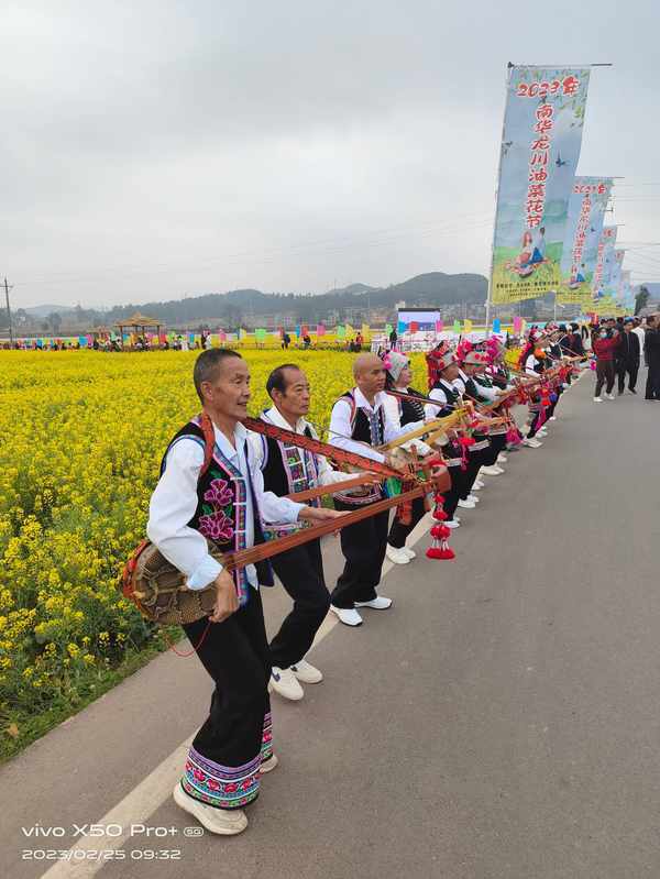 进入油菜花田间的龙川江桥头入口处的道路两旁,胸前抱着大三弦的一大群身着民族服装的南华各族男女分别排立左右,纵情起舞,步伐铿锵,舞姿豪放,弦声合着铿锵的脚步声响彻田野。