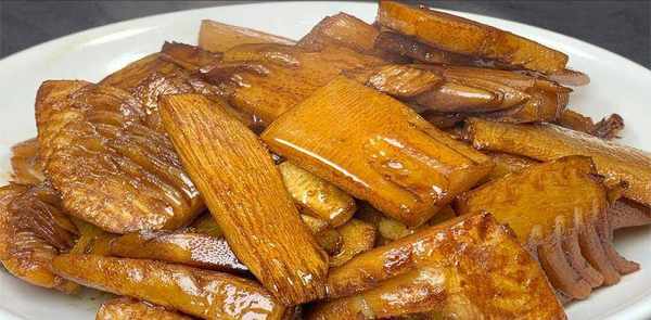 2、锅中油热后,放入春笋炒至两面微黄,加少许酱油和糖,增加春笋干的鲜度。炒匀,开小火煎两分钟左右。煮熟后可能会从锅里出来。很好吃,用料简单,调料也比较简单。