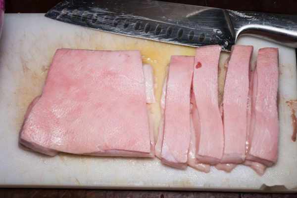 先说最常吃的猪皮。因为猪皮的皮下脂肪层很厚,并与真皮层中的脂肪组织咬合、勾连在一起,所以剥猪皮的时候,皮内面总是零星带有少许皮下脂肪组织。