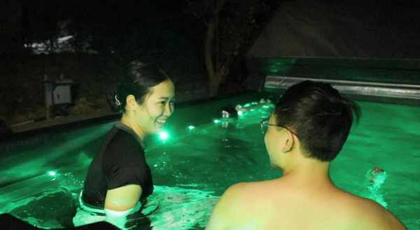 在热热的山泉水中,收缩的筋骨一下子舒展开来,整个人都轻松了。水雾袅袅中,看着漫天的繁星,听着水流潺潺和山里虫鸟的叫声,却也是别有一番风味。