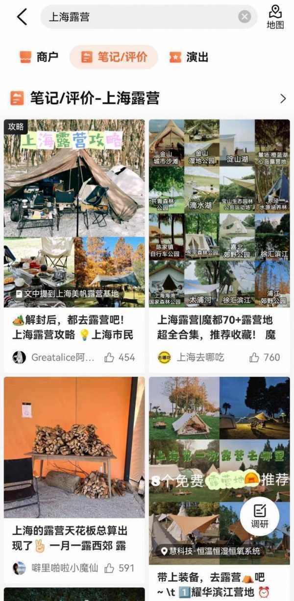根据美团、大众点评等多个平台数据显示,近两周,“露营”相关搜索量同比上升450%,笔记数量增长约300%。其中,包括上海在内,成都、广州、深圳等十地成为全国露营热度最高的城市。