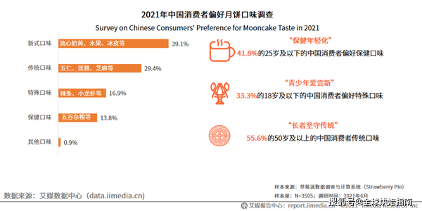 消費者對月餅不僅有對派系的偏好,還有在不同年齡段間對月餅口味的偏好,從艾媒諮詢資料顯示來看,堅定了月餅需要以年輕式新口味化、以及保健式健康化的方向發展。