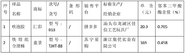 3、從鄰苯二甲酸酯來看,有2件玩具樣品超出標準要求,其中1件吹泡膠達到標準要求值的7倍,1件鐵塔組合滑梯達到標準要求值的4.5倍。