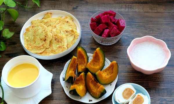 南瓜瘦肉小米粥一碗(加橄榄油或亚麻油):瘦肉20克,南瓜30克,粳米40克