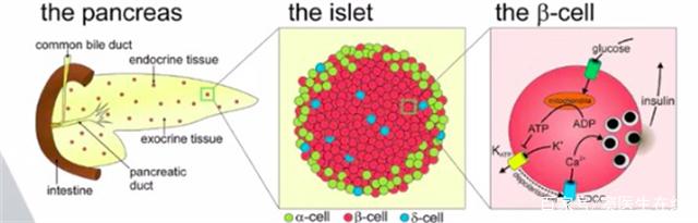 於此同時胰腺也是內分泌腺,成人胰腺中大約有兩百萬個胰島,但是僅僅為胰腺重量的百分之一到百分之二。每個胰島有數千個細胞,主要有A細胞、B細胞和D細胞。A細胞分泌胰高血糖素,B細胞分泌胰島素,D細胞分泌生長抑素,而這生長抑素主要是調節A細胞及B細胞的分泌。