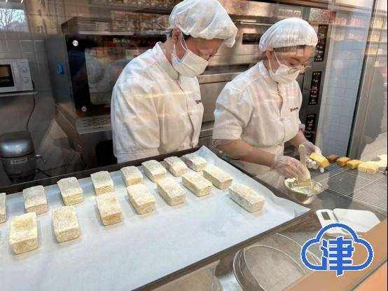 初春三月,金茂汇的祥禾饽饽铺里,顾客正围在玻璃窗前观看面点师傅现场制作招牌产品枣泥糕。