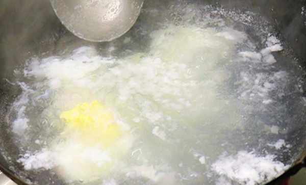 2.锅内烧水、大概九十度,开始起鱼眼泡的时候,把鸡蛋一个个沿锅边磕进去,沸水下锅的话,鸡蛋很容易冲散。慢慢地煮至鸡蛋定型,轻轻晃晃锅、省得糊底。