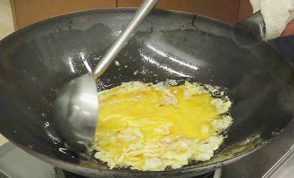 4.锅内留底油,油热倒入鸡蛋液来回的推动,把鸡蛋炒至全部凝固,颠锅炒散,倒出来备用。