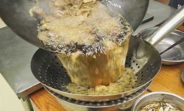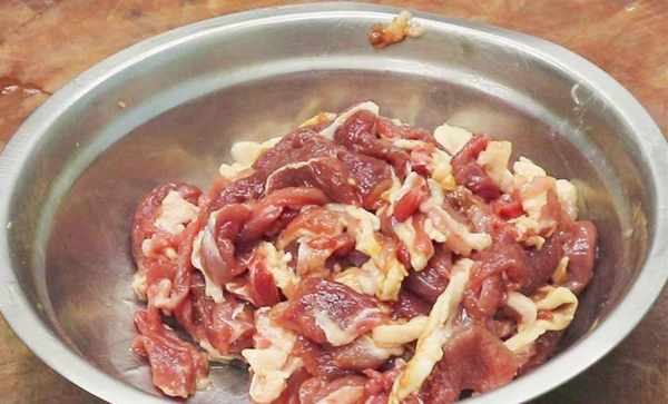 3.起锅烧油,油温四成热时倒入肉片用筷子搅散,滑炒30秒钟左右把肉片倒出来控油备用。