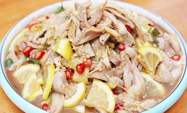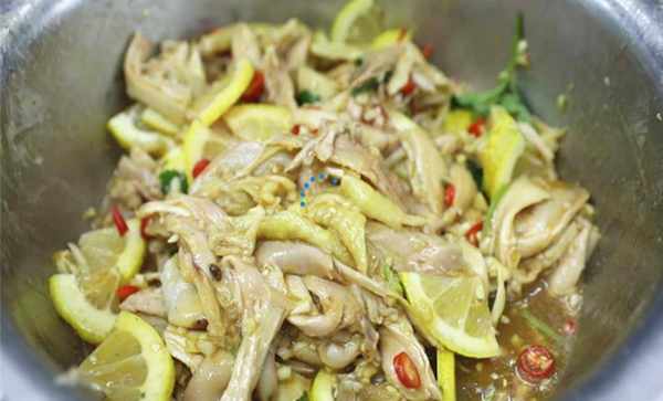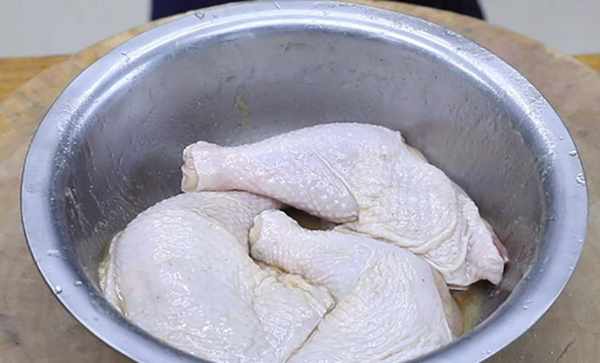 1.准备三个鸡腿,清洗干净放入盆中,淋入一勺植物油,撒上适量的盐焗粉,抓拌均匀,腌制10分钟给鸡腿入底味。切点柠檬片、小米椒圈、蒜末、香菜段放在一起。