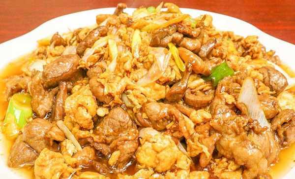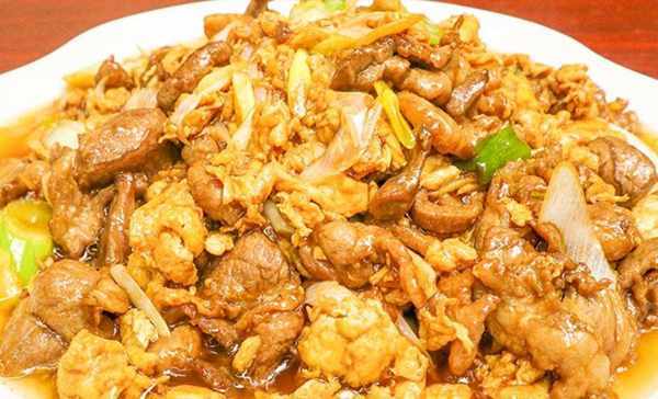 5.锅内再烧油,放入葱姜蒜爆香,倒入肉片和鸡蛋翻炒,淋入刚刚准备好的碗料,转大火颠锅翻炒给食材入味,烹出来醋香以后立即出锅。