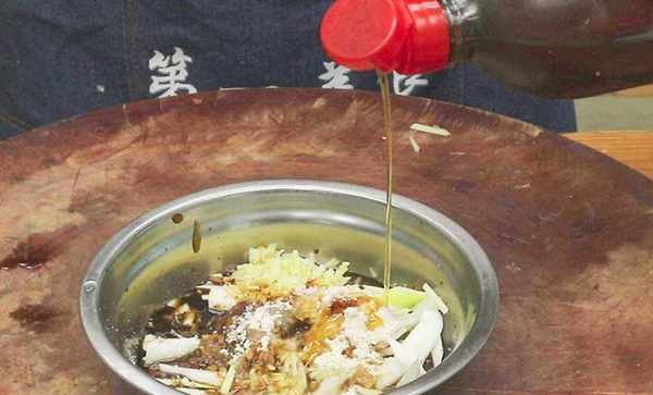 4.把鸡汤倒进刚刚切好的小料里面,加入适量的生抽、陈醋、香油、鸡粉搅拌均匀,连汤带料一起倒在鸡肉上面,抓拌均匀就可以装盘了。