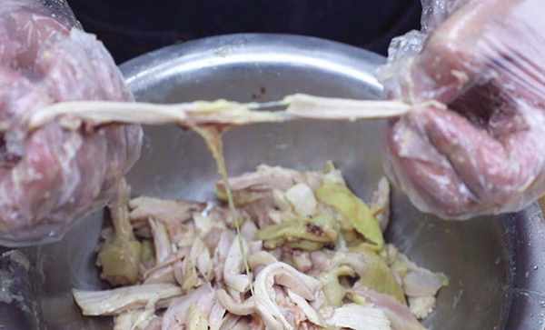 3.20分钟以后鸡腿已经蒸熟,把它取出来放在一边晾一会儿,晾凉以后把鸡腿捡出来,控出碗底的鸡汤,把鸡肉拆下来撕成小块,尽量小一点好入味。