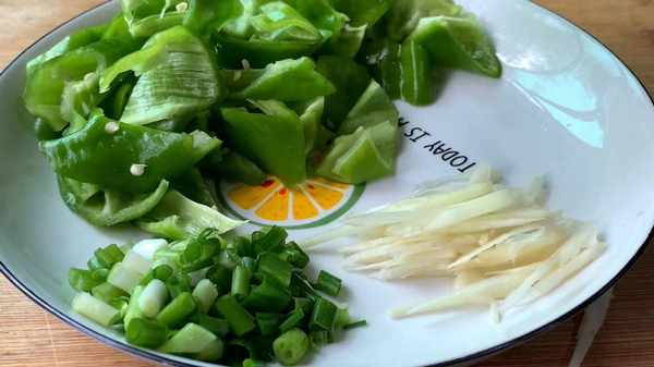 2.碗中打入3个鸡蛋,加入少许料酒,用勺子搅拌均匀,青椒切斜切成片、小葱切葱花、生姜切姜丝、全部切好后装入碗中备用。