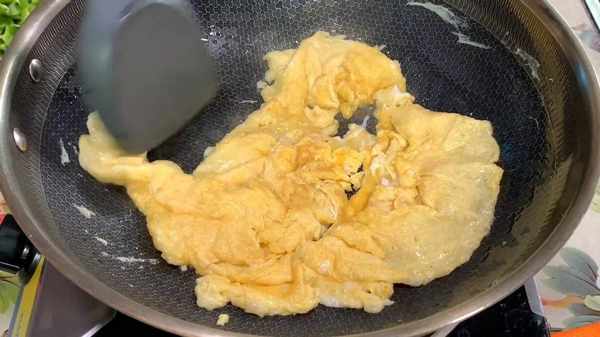 4.锅内倒入适量的油,油热后倒入鸡蛋液,煎至定型后,用铲子划成小块,炒好后盛出备用。