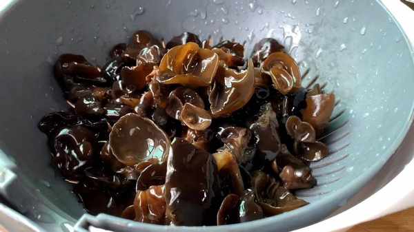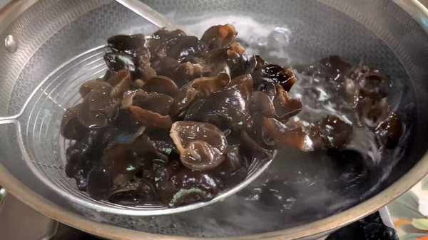3.锅内倒入适量的水,水开后倒入木耳,用勺子搅拌几下,使其受热均匀,焯水3分钟左右,捞出控干水分备用。