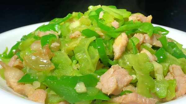 5.大概翻炒一分钟左右,加入少许食盐、鸡精和腌制好的瘦肉,再次快速翻炒,将瘦肉炒熟,倒入青椒,将青椒炒至断生,就可以出锅了。