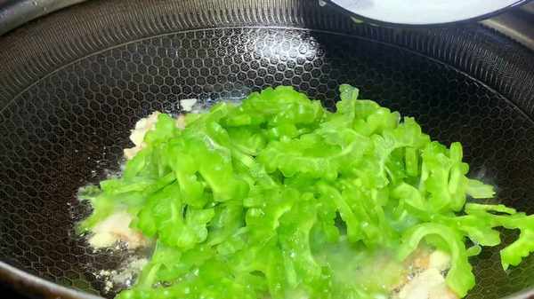 将肥肉炒至微黄,下入蒜末,炒出香味后,倒入苦瓜,大火快速翻炒。