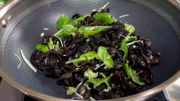 5.锅内倒入少许食用油,下入葱姜,炒出香味后,下入青椒、黑木耳,简单翻炒几下,加入一勺食盐和白糖,大火快速翻炒均匀。