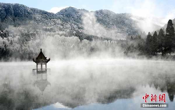 庐山的花径也叫“白司马花径”,曾是庐山历史上的三大名寺(西林寺、东林寺、大林寺)之一的大林寺所在地。白居易在江州做“司马”时,在这里写下了著名的七言绝句《大林寺桃花》:“人间四月芳菲尽,山寺桃花始盛开。”图为花径景区的九曲桥上雾气缭绕。中新社发 胡国林 摄 图片来源:CNSphoto