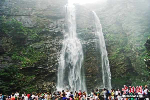 “不到三叠泉,不算庐山客”这句俗语说明了三叠泉对庐山的重要性。三叠泉被古人称为“匡庐瀑布”,誉为“庐山第一奇观”。图为游人在三叠泉游览。图/视觉中国