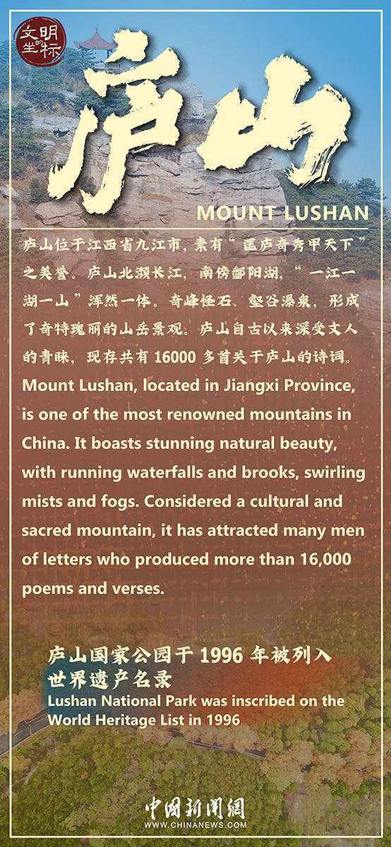 庐山位于江西省北部,北濒长江,南傍鄱阳湖,以雄、奇、险、秀闻名于世。唐代诗人李白曾这样赞美庐山:“予行天下,所游山水甚富,俊伟诡特,鲜有能过之者,真天下之壮观也。”庐山共有90多座山峰,最高峰汉阳峰海拔1474米。奇峰秀瀑、云海温泉与悠久文化交相辉映,有“匡庐奇秀甲天下”之盛誉。春光明媚,踏青正好,一起去领略庐山风光!
