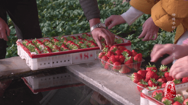 不过,村中的草莓大棚里,却是截然相反的气象,果农们正热火朝天地将一颗颗红彤彤的草莓装进包装盒里。
