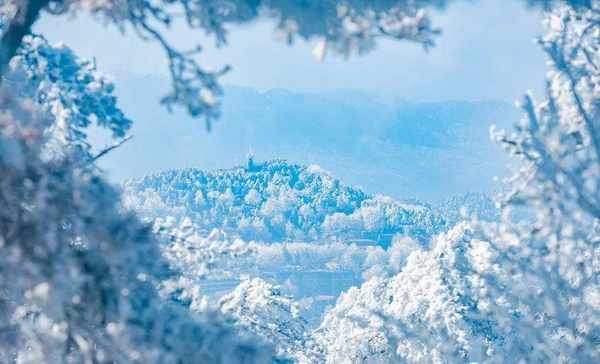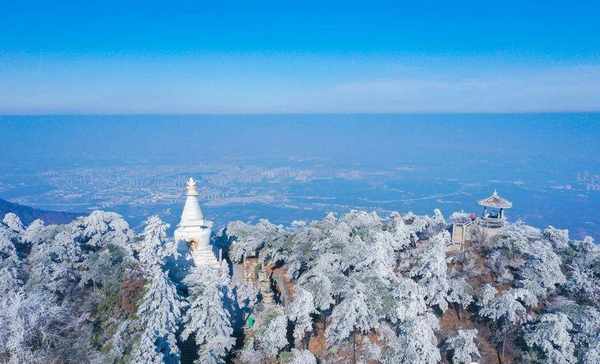今日,天空放晴,湛蓝天幕下洁白厚实的庐山雾凇与山下春光明媚的城市之景形成了鲜明对比。阳光下的草木被雾凇包裹,变成了袅袅婷婷的玉树银花,千姿百态,冰莹玉洁,璀璨夺目。