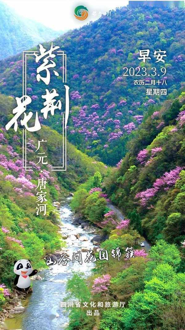 今日安逸四川日历海报带大家走进广元唐家河,寻觅山谷间的紫荆花簇。