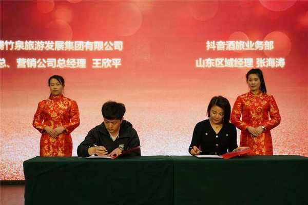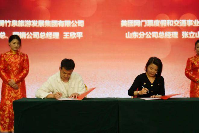 山东龙腾竹泉旅游发展集团有限公司集团副总、营销公司总经理王欣平和临沂国际旅行社、美团网、抖音等媒体签署2023年度战略合作协议及合作意向书。