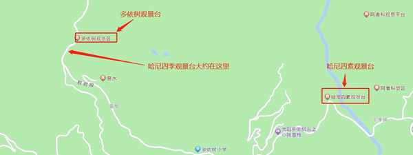 注意:哈尼四季观景台与哈尼四素观景台不是一个地方;哈尼四素观景台是伸出大山的,风景独美!在多依树继续往东南方向大约3.6公里的地方;