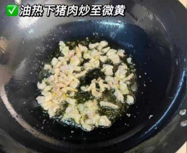 第六步:锅底调入一些食用油,倒入一些肥肉丝,让猪油都炒出来,倒入腌制好的瘦肉丝,迅速煸炒至变色,加上生抽和老抽半勺,翻炒均匀。