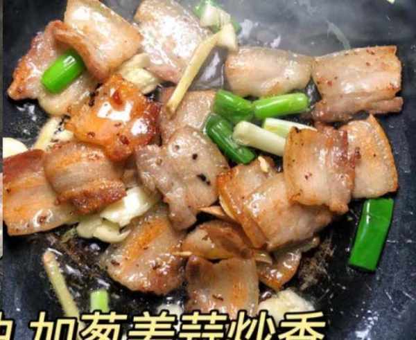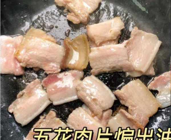 第四步:锅中提前预热一会儿,放入一些五花肉煎出肥油,迅速翻炒一小会儿,加上一些葱姜蒜爆香,翻炒均匀。