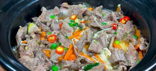 3、砂锅中加入适量的油,油热后加入洋葱、大蒜和生姜炒出香味。再把金针菇,胡萝卜丝也加进来铺均匀,然后再把腌好的牛肉铺在上面,整理平整,然后再加入半碗清水,盖上盖子,开小火炖十分钟,时间到了,撒上一点葱花和小米辣点缀一下,就可以了。