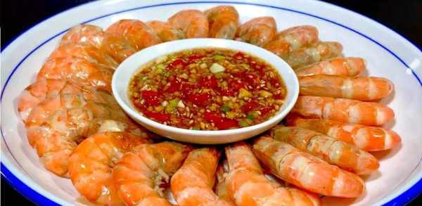 4、虾肉只要煮到全身变得通红,就说明已经熟了,然后出锅摆放在盘中。中间再放上准备好的蘸料,一道非常好吃的白灼虾就做好了。