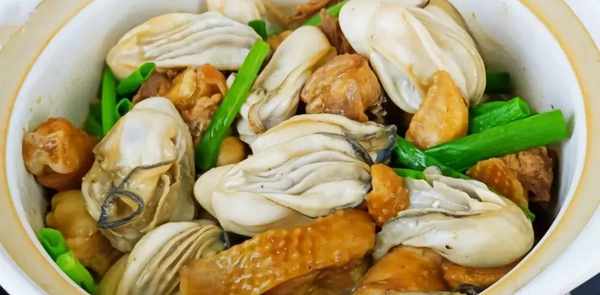 2、生蚝清洗一下,放几勺生粉抓洗之后用清水漂洗干净。先把鸡肉下锅炒香。取一个砂锅放入姜葱蒜炒香,然后把鸡肉移到砂锅里,上面铺上生蚝铺平,撒点胡椒粉,淋上一圈生抽调味,盖上盖子,用中小火焖10分钟。