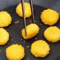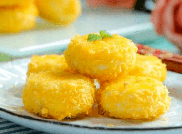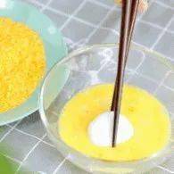 将蘸满鸡蛋液的山药饼,表面均匀地蘸满面包糠。