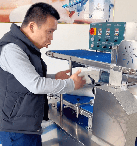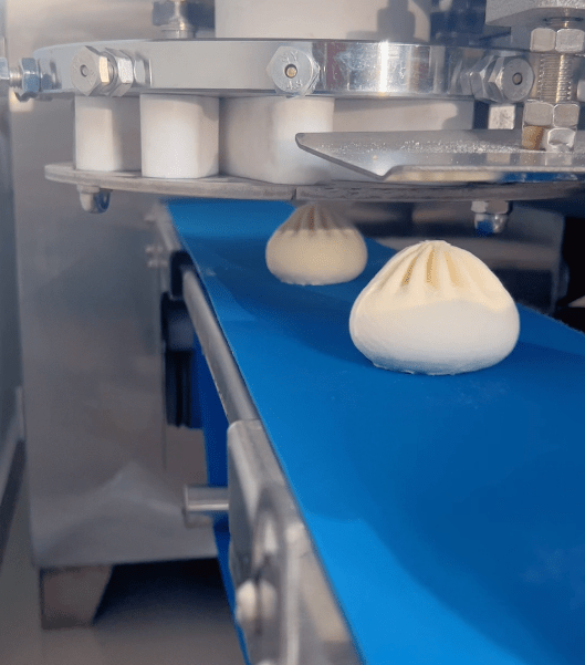 在馅料和面团准备完毕以后,然后就是上机制作包子,在制作包子过程中,先加入馅料然后在放入面团(面团需要用压面机或擀面杖压平,这个过程也等于是揉面提筋,使面皮口感更好),在两者准备就绪以后,然后就是使用三好包子机包制成型。