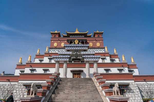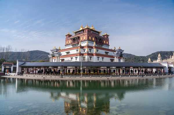 与灵山梵宫相对水畔旁的建筑是 五印坛城,是一座典型的藏传佛教风格的建筑,外观庄严而辉煌,且完美融合了彩绘、壁画、唐卡、木雕、壁饰等藏族装饰艺术,在这里可以体验到推转玛尼经筒和点燃酥油灯的活动。