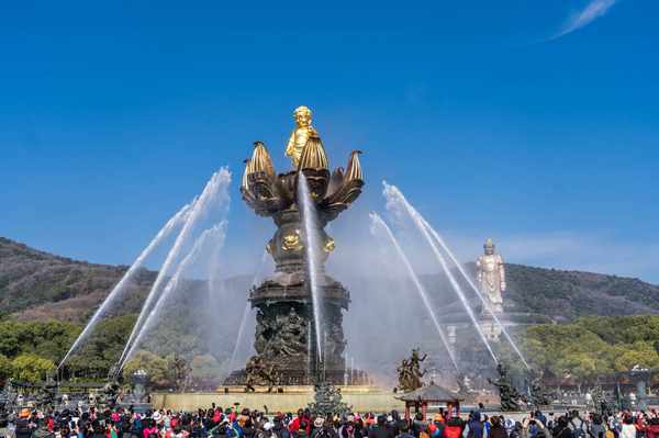 来灵山大佛一定不要错过 九龙灌浴,位置在灵山大佛的广场里,随着音乐的伴奏、莲花开合、太子佛从中徐徐升起,在九龙喷水形成的水幕中自转一圈。 九龙灌浴每天有五次表演,表演完毕后,广场周围的龙口会喷出功德水,游客可以带走。