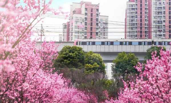 粉色的美人梅花朵挂满枝头,从站台驶出的轨道列车穿行于花海之中。